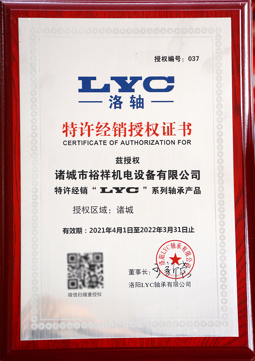 LYC軸承授權(quán)證書