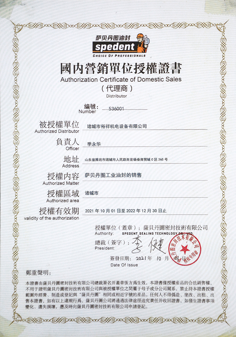 薩貝丹圖工業(yè)油封授權(quán)證書